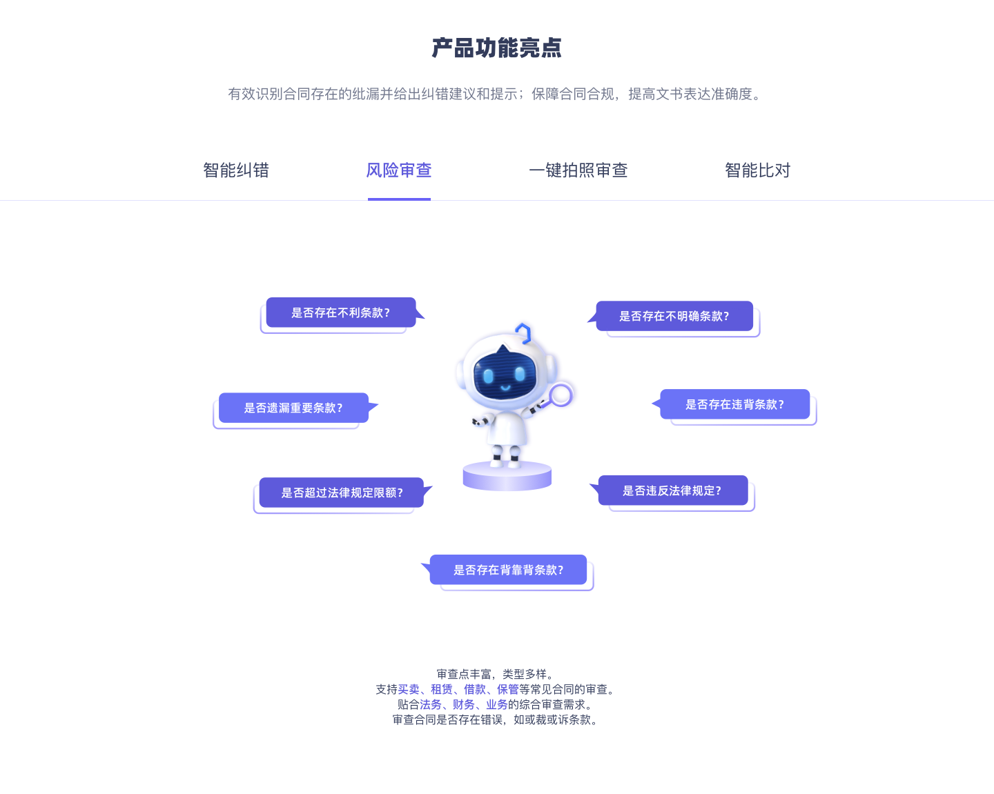 智能合同审查是金年会app有限公司研发的一款结合事件知识图谱、知识链、事件链结构表达合同文本的智能应用产品。其利用深度神经网络模型结合专家知识规则进行要素抽取,采用智能规则引擎算法结合法律法规对当事人的约定和合同的内容、格式进行审核,结合多轮问答模式进一步挖掘合同中未体现的合同情形。利用AI能力让合同风险无处隐藏,使法律概念贯穿合同每一环节,让合同审查变得更加智能高效,机器读懂合同,为用户和律师提供了互赢互利的服务。